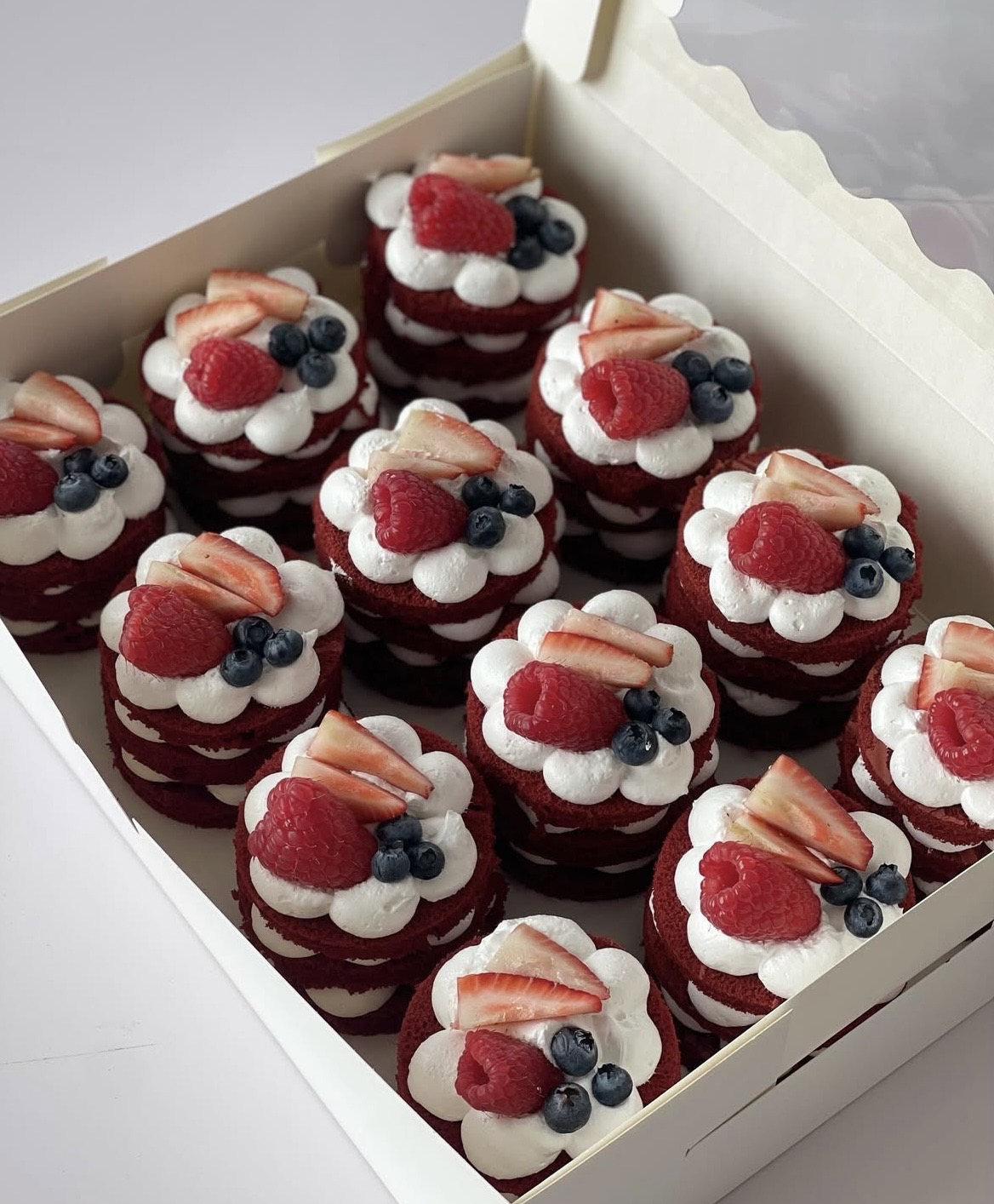 Caja de 6 o 12 tartas individuales estilo naked, elaboradas con bizcocho suave, relleno cremoso y frutillas frescas que aportan un toque natural y delicado. Perfectas para compartir o regalar, combinan sencillez, frescura y sabor en cada porción.